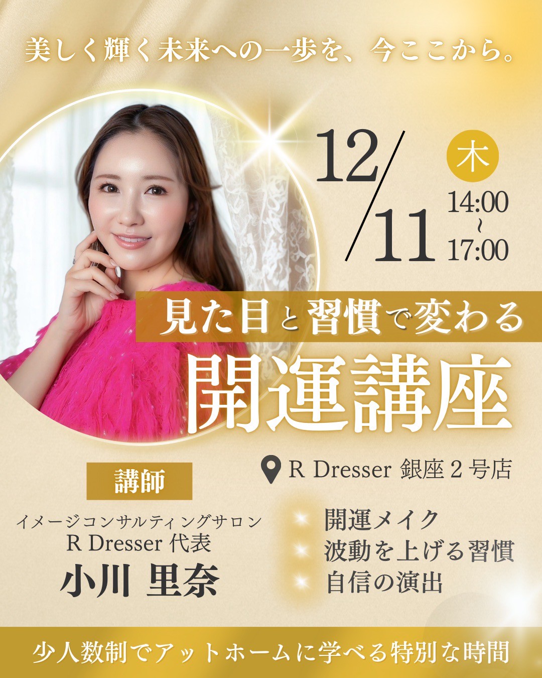 本セミナーでは、当サロンオーナーの小川里奈が実践してきた「開運メイク」「波動を上げる習慣」「自信の演出」を、わかりやすく解説します。